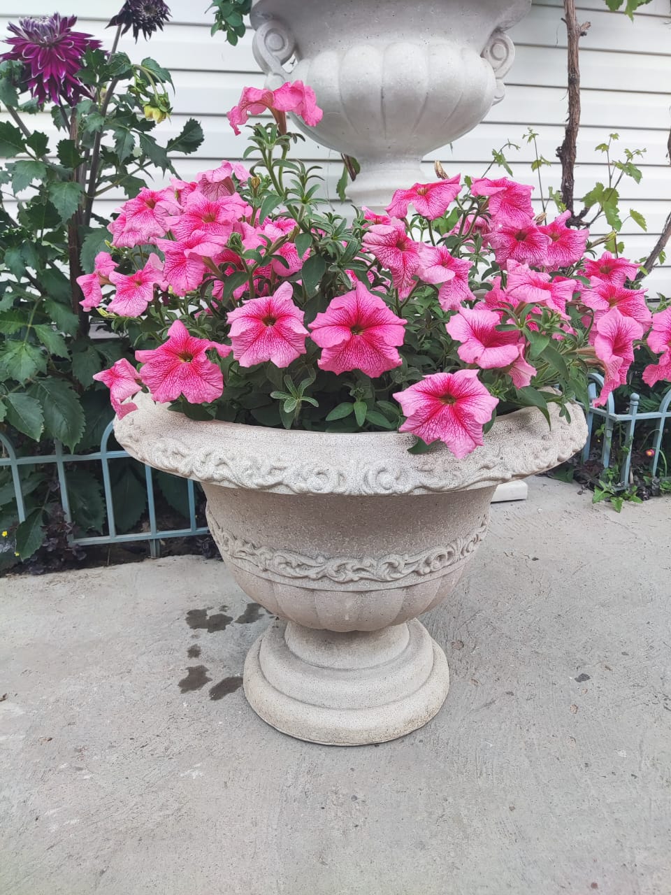 Это еще одна модель вазона, который несомненно придаст особый шарм вашему саду. Вазон с невысокой ножкой и имеющий глубокую чашу, станет отличной емкостью для цветов, а гармоничное сочетание формы вазона и шапки цветущих растений в нем, станет одним из немногих  ярких акцентов в оформлении вашего сада.